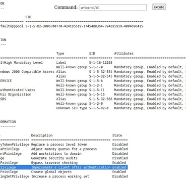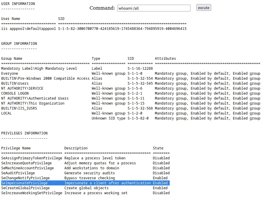 Anytime I see a user have the SeImpersonatePrivilege I like to note it and think "Privilege Escalation" (maybe potato or printspoofer). However, this box is actually going to be a little more simplistic than that, even though it would work. I'm going to go down a different avenue that I think is a really good learning point.