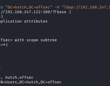 -b “DC=hutch,DC=offsec”: Sets the base DN (Distinguished Name) for the search.
